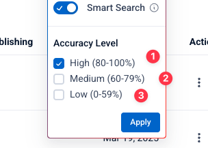 - High (80-100%) — Returns only the closest matches to your search. Best when you know exactly what you're looking for and want precise results.