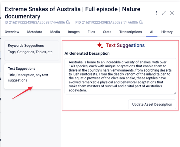 Text Suggestions — Displays AI-generated suggestions for Title, Description, and other text fields. These can be referenced when manually updating the asset's metadata.