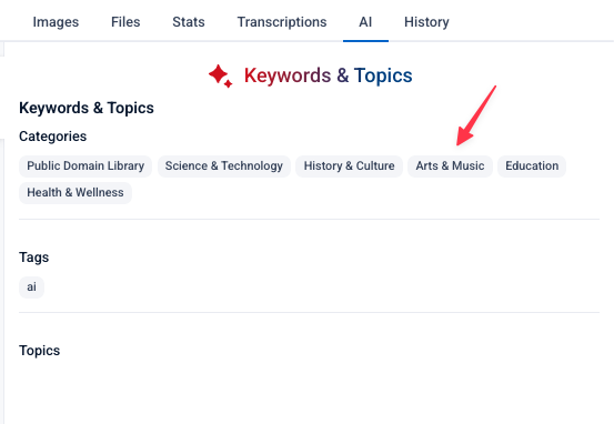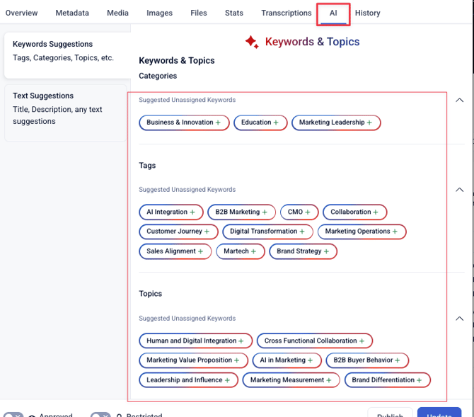 Note: If no AI suggestions appear, it means the asset was uploaded before AI was enabled on your account, or before the relevant AI settings were configured. Only assets uploaded or imported after AI is turned on will be processed.