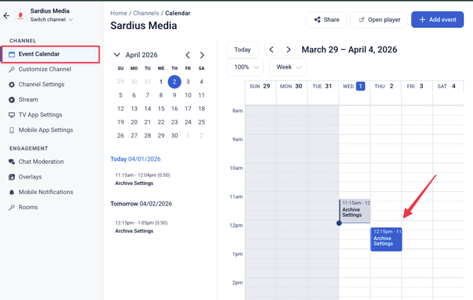 Access your channel’s Event Calendar and locate the upcoming live event you wish to archive.