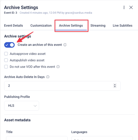 - Archive Auto-Delete in Days: a setting that schedules an archived asset to be automatically deleted a set number of days after the event ends (set for 0 if you do not want it to be automatically deleted)