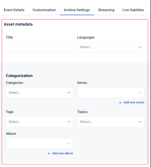 Tip: If your channel has Archive Default Settings configured, these categorization fields will already be pre-filled based on your channel defaults. You can update them here if this specific event needs different values.