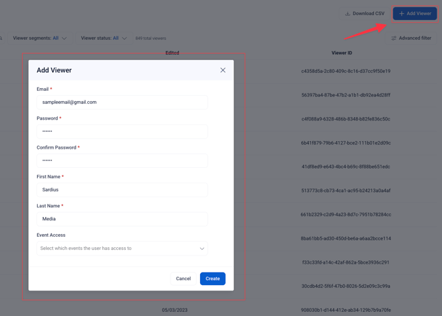 Click Add Viewer in the top right corner. A modal will appear where you will fill out their information, and at the bottom you will choose the event/segement you want to give access to. Make sure to save by clicking Create.