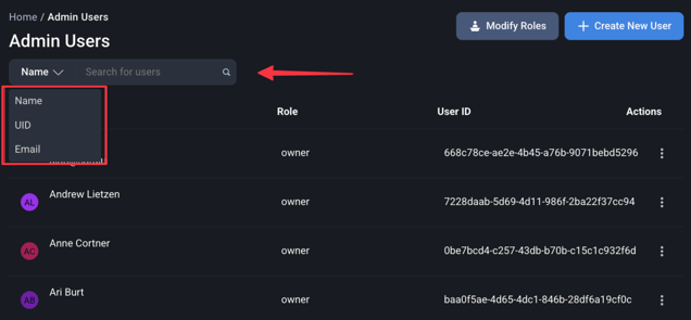 Helpful Tip: You can search for users by entering their Name, User ID/UID, or Email in the search bar at the top of the page