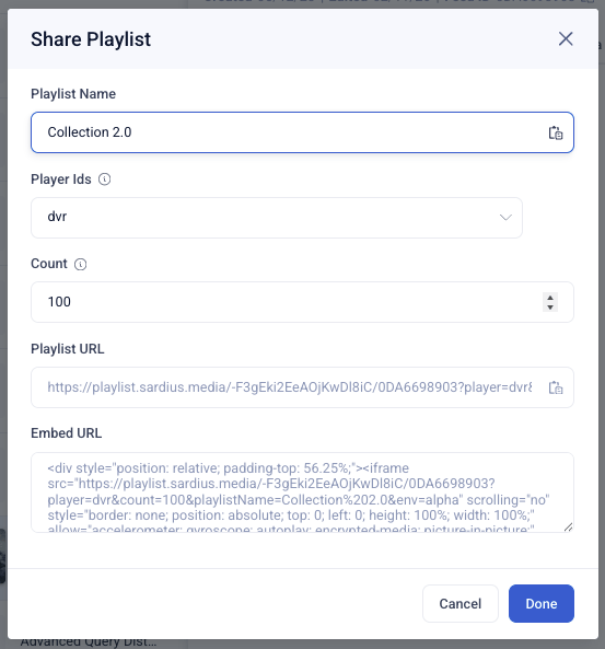 - Player ID — Select which player configuration powers the playlist. which updates the Playlist URL and Embed URL automatically