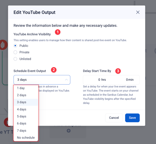 - Adjust YouTube Archive Visibility, Schedule Event Output, and Delay Start Time By as needed