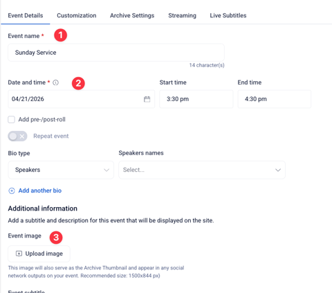 - Event Image — Edit your event. On the Event Details tab, scroll down to the Event Image option. Click Upload Image and select your file. (Recommended size: 1500 x 844 px). This image will also appear as your YouTube video thumbnail and will serve as your Archive Thumbnail once the event finishes.