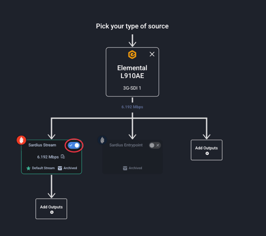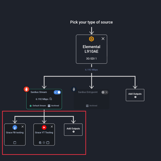 Choose where your stream will be delivered by clicking Add Outputs under the Sardius Stream modal.