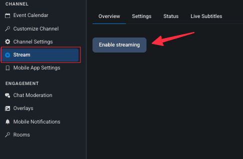 To do this, select "Stream" from the Channel sidebar navigation and click Enable Streaming